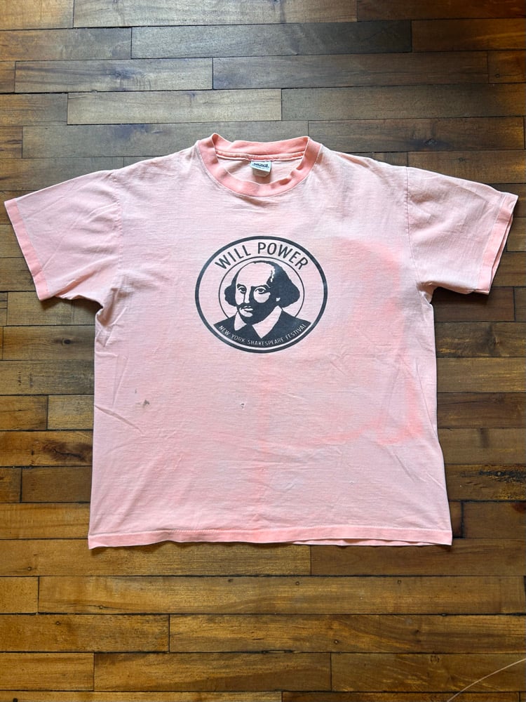 This shirt is in vintage condition with fading, signs of wear, three pinholes, and some light stains on the front
