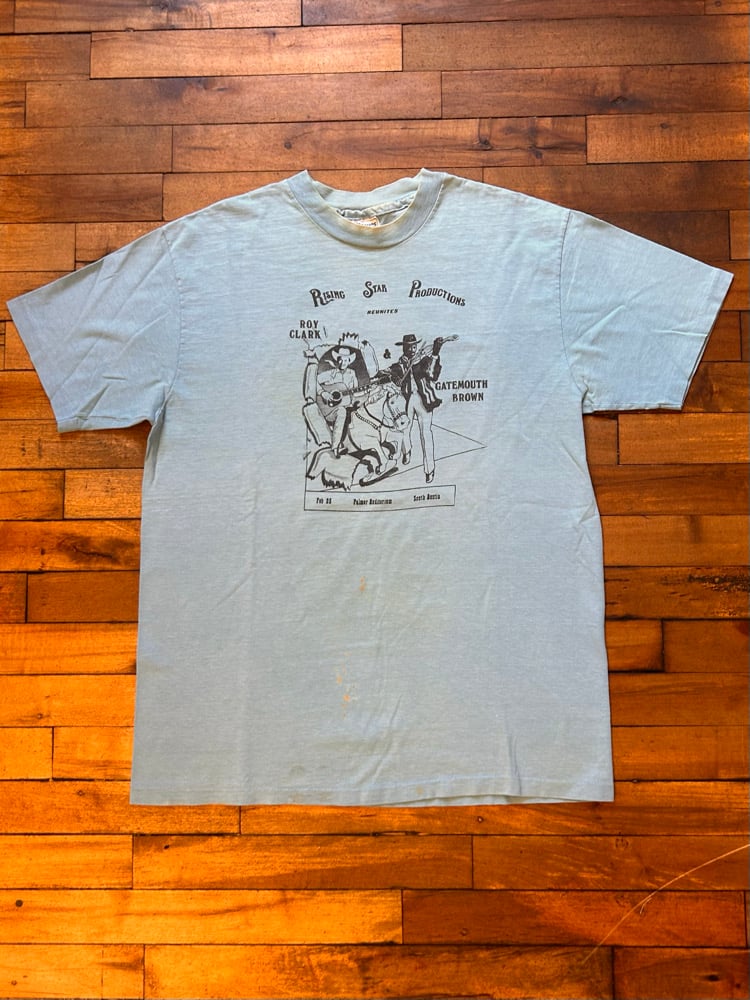 This shirt is in vintage condition with fading, light signs of wears including discoloration around collar and staining on front.