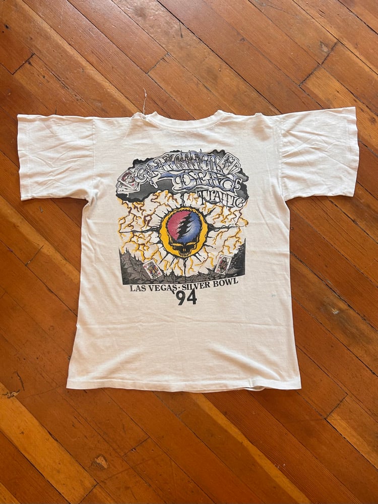 This shirt is in vintage condition with fading, two seal holes on the shoulders, a few small pinholes and stains of the front and back, and a seam hole on the left armpit.